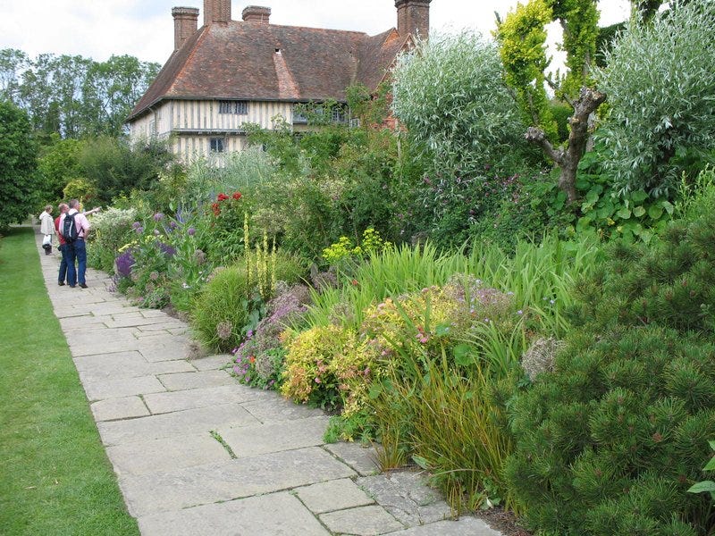 The house at Great Dixter was built by Lutyens as a romantic recreation of a medieval manor and the garden was created by Christopher Lloyd. The garden mixes bold plant choices with traditional layouts.