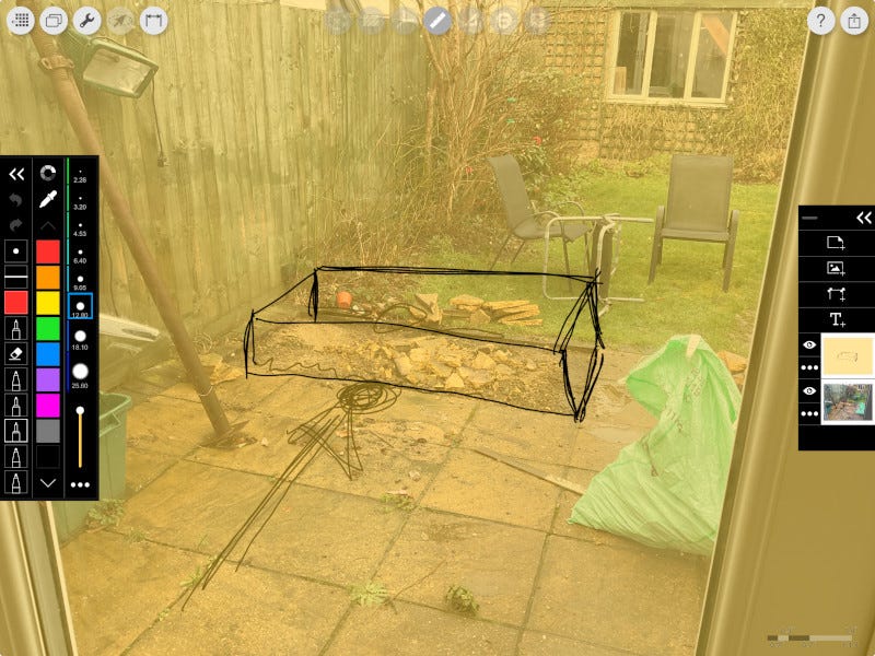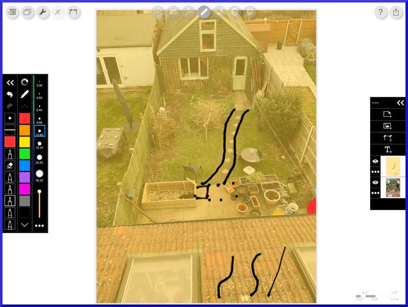 Visual communication is key to success in garden design. I am OK with writing on paper like a boomer, but I prefer to use a tablet. Using a tablet such as an iPad, I can take a picture and annotate over it, like tracing paper. This helps visualise information in a powerful way. It helps to communicate with others and also to help others communicate with me.